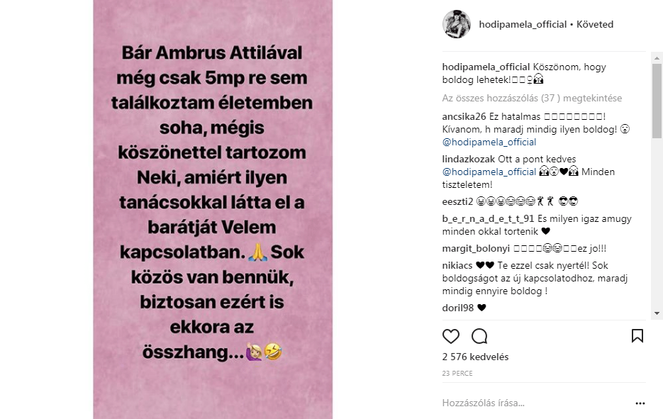 „Bár Ambrus Attilával még csak 5 mp-re sem találkoztam soha, mégis köszönettel tartozom neki, amiért ilyen tanácsokkal látta el a barátját velem kapcsolatban. Sok közös van bennük, biztosan ezért is akkora az összhang” – írta Hódi Pamela az Instagramján.
