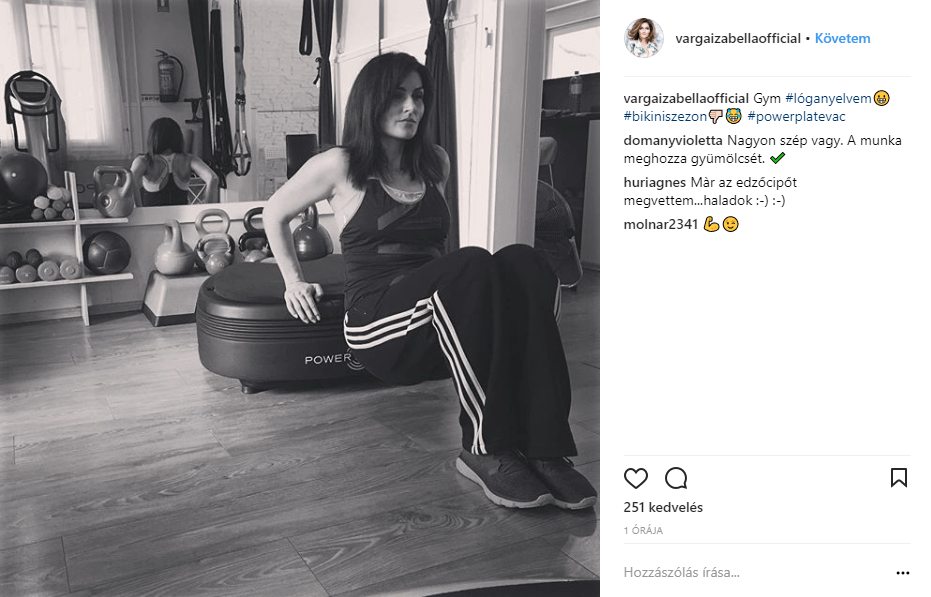 Varga Iza az egyik legkeményebb és manapság legdivatosabb edzésmódszert választotta, a Power Plate-tel erősíti magát. Látszik rajta, hogy mennyit változott, mióta ezt a sportot űzi. A képleírásból pedig az is kiderül, hogy nagyon fárasztó, amit csinál, viszont a bikiniszezon vészesen közeleg, így kénytelen szenvedni.