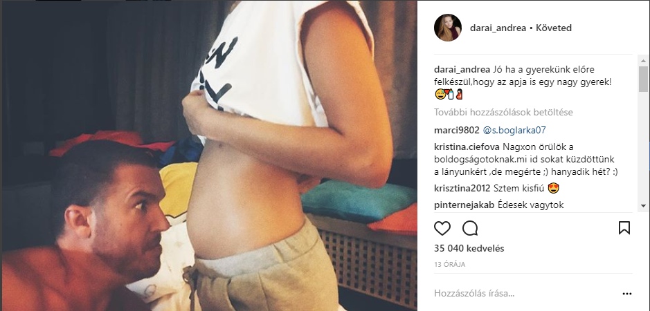 „Jó ha a gyerekünk előre felkészül, hogy az apja is egy nagy gyerek!” – írta Darai Andrea a fotóhoz. A rajongók egyből elkezdtek találgatni a pocak formája miatt, hogy milyen nemű lesz a baba. Kasza Tibi és Manker tegnap este egy élő videóban elárulta, hogy már megcsinálták a kötelező teszteket, de még nem kaptak eredményt a pici nemével kapcsolatban, azonban nemsokára ezt is bejelentik.