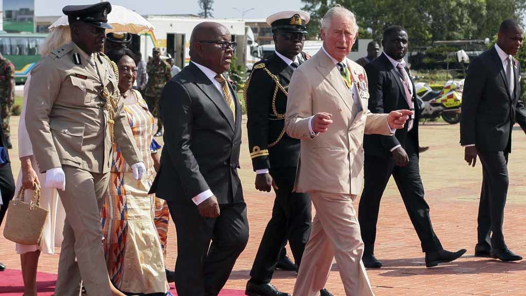 Accra, 2018. november 4. Károly walesi herceg, brit trónörökös (j) Mike Oquaye, a ghánai parlament elnökének (k) társaságában érkezik a tiszteletére adott fogadási ünnepségre, Accrában 2018. november 2-án. MTI/EPA/Christian Thompson