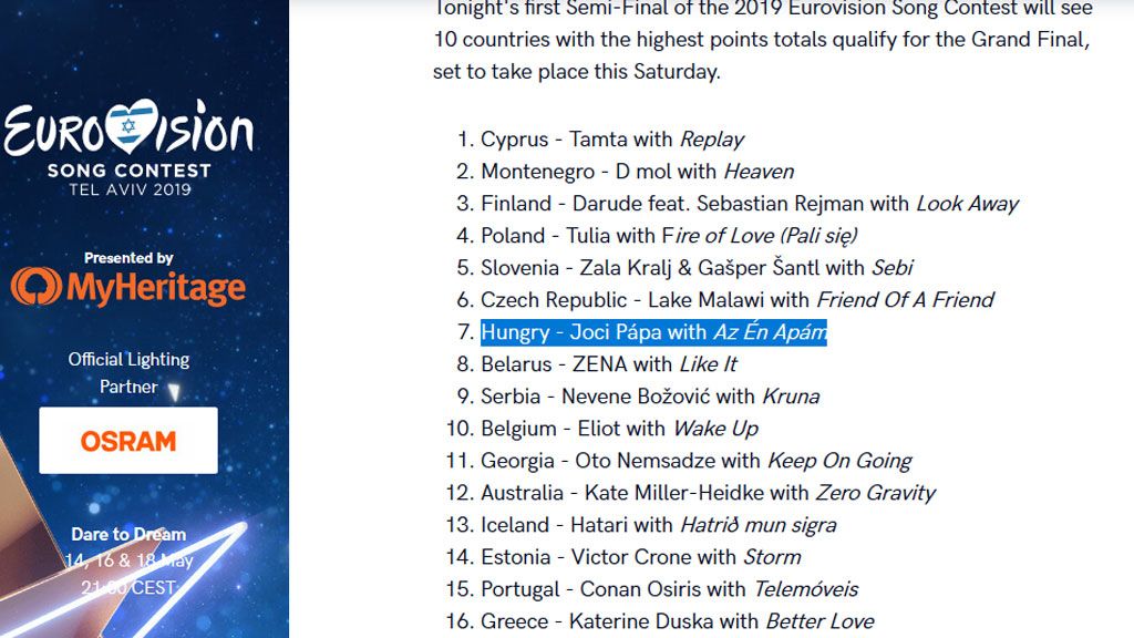A dalfesztivál hivatalos honlapján azonban kínos bakit követtek el, amikor felsorolták az elődöntő résztvevőit. Ráadásul éppen Magyarországot érinti a tévedés.