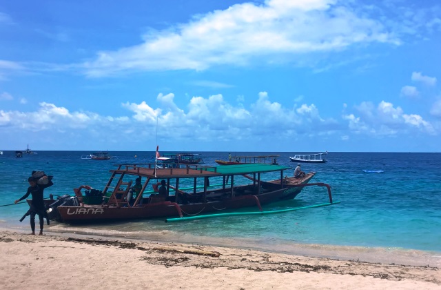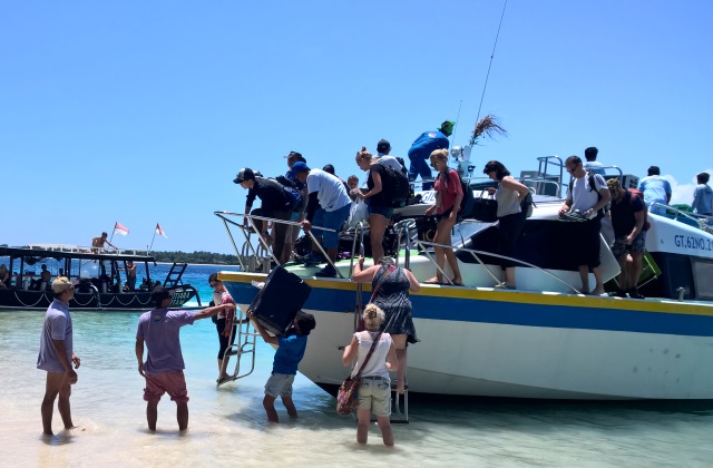 Egyébként már a szigetre sem léphettünk be cipővel, sőt elhagyni is csak mezítláb tudtuk. Nincs kikötő, a hajók a parton állnak meg, mindenki úgy ugrik le a fedélzetről vagy mászik fel a létrán, ahogy tud. De még ez sem zavaró, hiszen hozzátartozik ehhez a Bali közelében található különleges és egzotikus szigethez.
