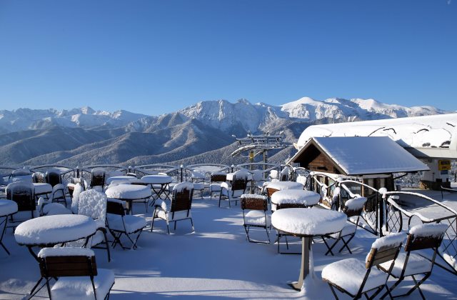 Friss hó lepi a székeket és asztalokat az egyik kilátó teraszán (MTI/EPA/Grzegorz Momot)
