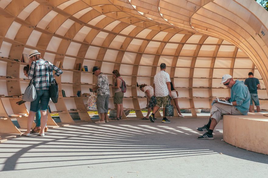 A speciális kialakítást a természet és az organikus formák ihlették, az ülőhelyekkel is ellátott, nyitott szerkezetű könyvtár pedig tényleg olvasásra hív minden arra járót. Az építmény 240, fából készült darabból épült fel, és 1500 könyv tárolására alkalmas.