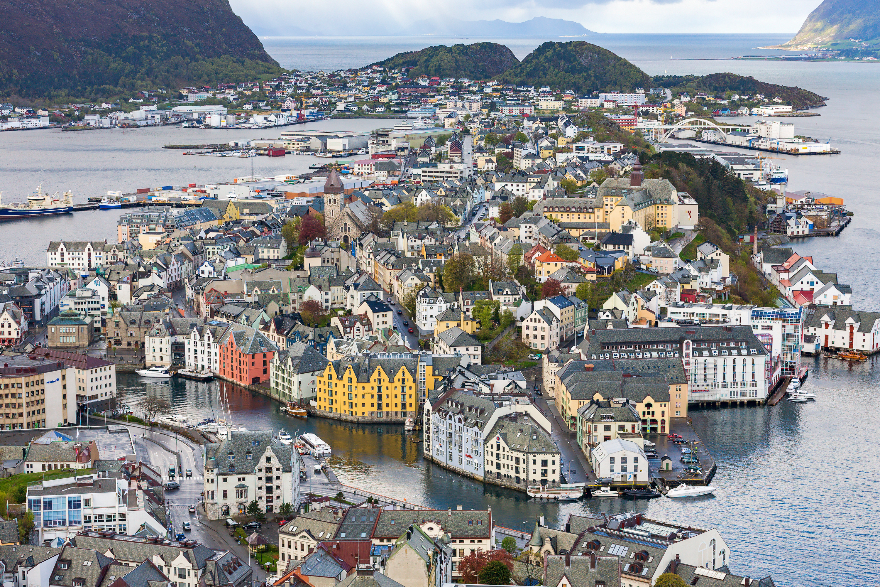Az 1906-os tűzvész után, melynek során 10 ezer ember veszítette el otthonát, a fiatal norvég építészek a nemzeti romantika, a kortárs európai építészet és a szecesszió stílusjegyeit elegyítve érték el a különleges látványt és hangulati hatást. Az Atlanti-óceán partján található kikötőváros fekvése is egyedülálló látvány, különösen, ha a 418 lépcsőfokon megmászható Aksla-hegyről csodáljuk meg.