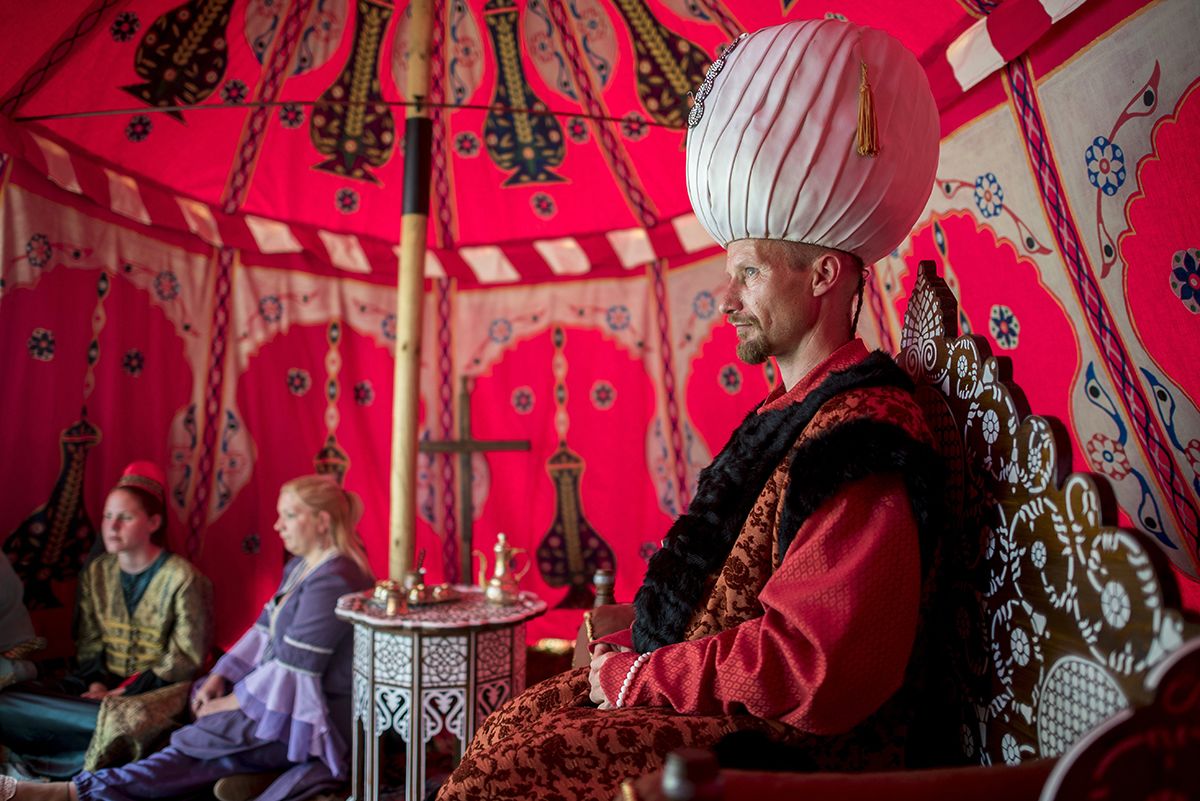 Szulejmán szultánt megszemélyesítő hagyományőrző a korhű török kori szultáni sátorban Szigetváron (MTI-Fotó: Sóki Tamás)