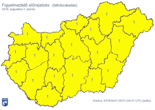 Emellett az egész országra a felhőszakadás veszélye miatt is elsőfokú figyelmeztetést adtak ki szerdára.