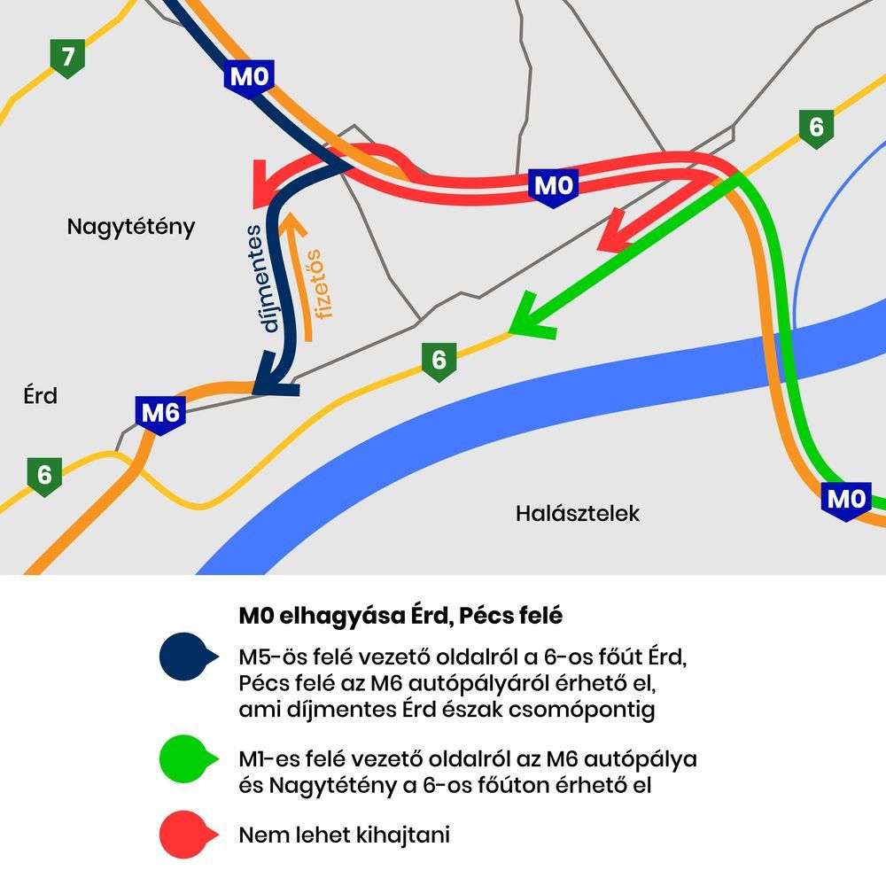 - Az M5-ös autópálya felé vezető oldalról nem lehet majd a 6-os főútra balra kanyarodni Érd, Pécs felé. Az erre közlekedőknek az autóútról korábban kell lehajtaniuk és az M6-os autópályán közlekedhetnek, amelynek az M0 autóúttól Érd észak csomópontig tartó szakasza díjmentesen vehető igénybe.