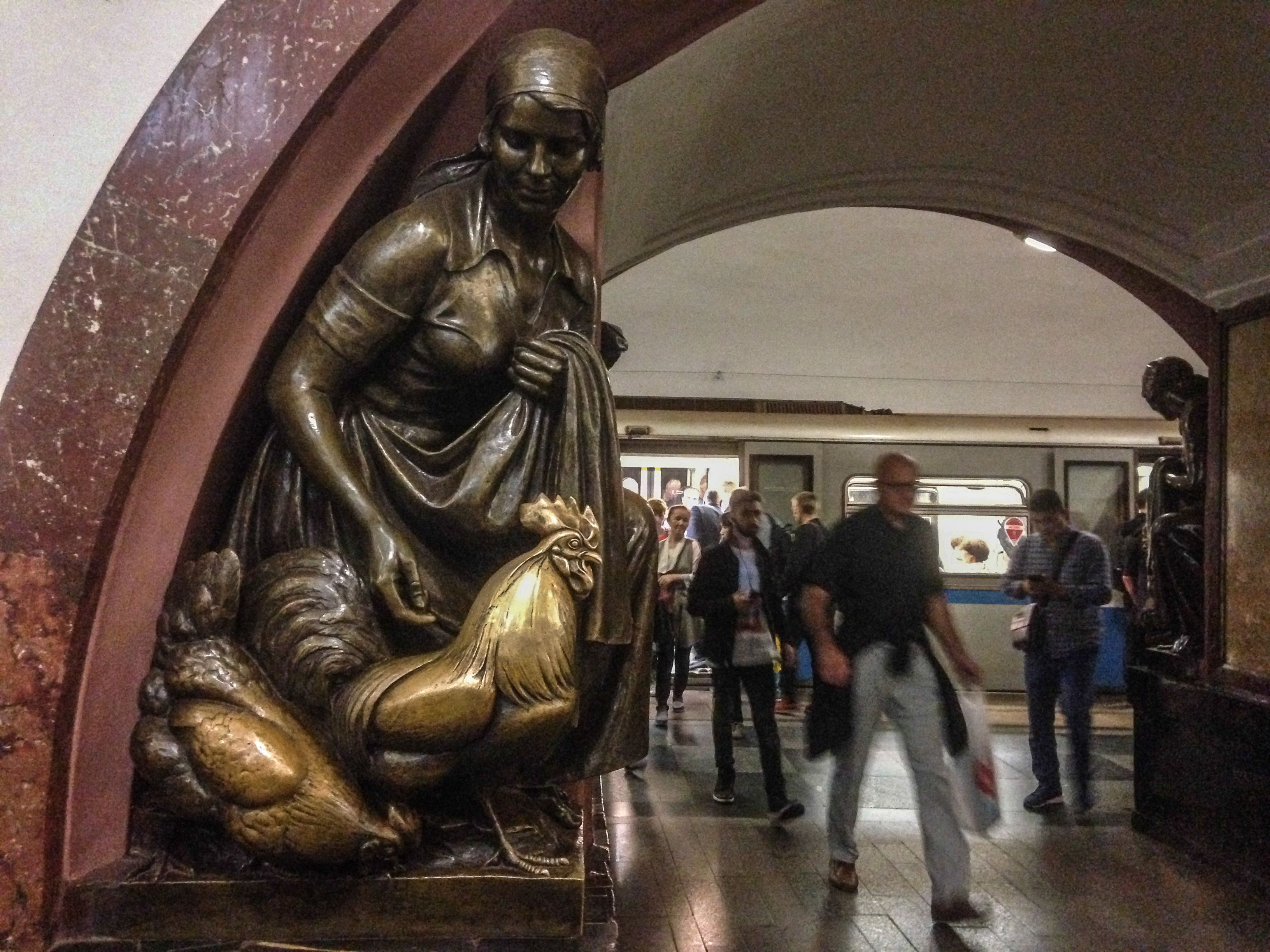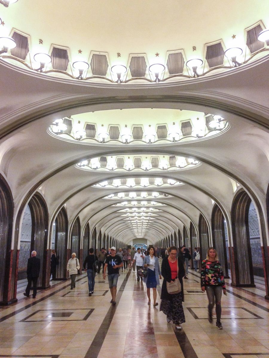Az első vonalat 1935-ben adták át, majd folyamatosan bővítették. 1958-ban már 6 metróvonal műkdött, most összesen 14 van. Percenként járnak a szerelvények, tehát aki bámészkodni akar, könnyen elcsábulhat, hamar jön a következő, egy jegy ára pedig 36 rubel, azaz kevesebb, mint 150 forint, ami múzeumi belépőnek igazán szerény összeg – és a bérlet még olcsóbb.