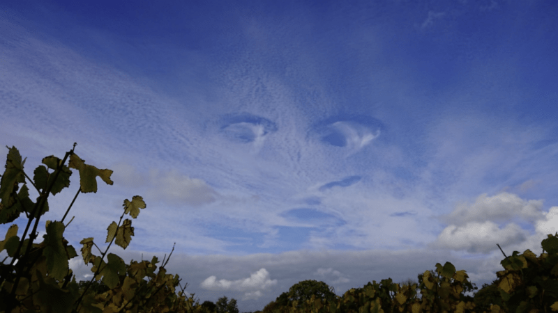 A brit Nicola Nicholas a Kentben található Sandhurst borbirtokon szüretelt néhány nappal ezelőtt, amikor az égre pillantva elképesztő jelenségre lett figyelmes. A felhők egy hatalmas, csodálkozó arcot rajzoltak ki, igen részletgazdag szemekkel. A nő azonnal lefotózta a különleges látványt.