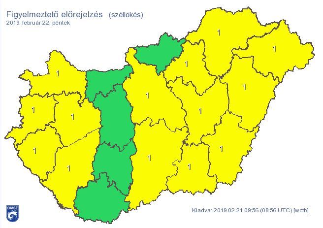Pénteken délelőtt többfelé várható eső, zápor, majd a déli óráktól észak felől elkezdődik a felhőzet csökkenése. A Duna vonalában és a Dél-Dunántúlon a nap második felében is várható csapadék. Estefelé az eső mellett a Dél-Dunántúlon havas eső is lehet, de havazás sem kizárt. A leghidegebb órákban 1-7 fok lehet, napközben 5-12 fokig melegszik a levegő. A szél napközben többfelé megerősödik, a középső területek kivételével viharossá fokozódik. Emiatt a meteorológiai szolgálat 14 megyére kiadta az elsőfokú figyelmeztetést.