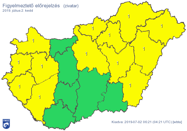 A zivatarveszély miatt Budapestre, Pest, Borsod-Abaúj-Zemplén, Fejér, Győr-Moson-Sopron, Hajdú-Bihar, Heves, Jász-Nagykun-Szolnok, Komárom-Esztergom, Nógrád, Somogy, Szabolcs-Szatmár-Bereg, Vas, Veszprém és Zala megyére elsőfokú figyelmeztetést adtak ki.