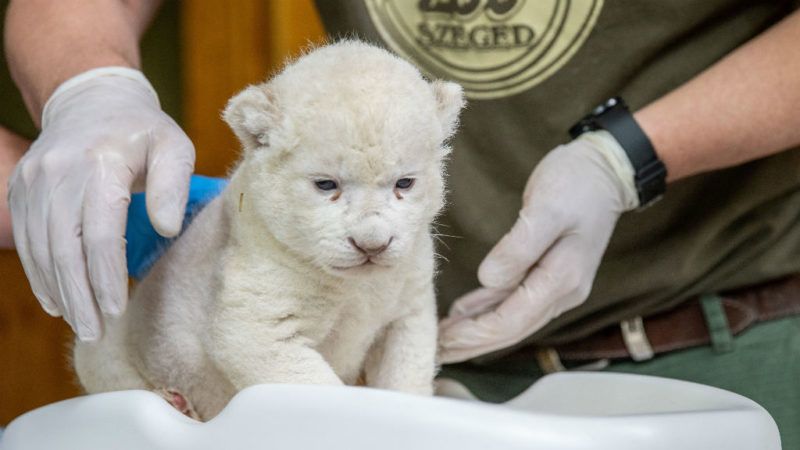 A Szegedi Vadaspark május 15-én született fehér oroszlánkölyke (MTI/Rosta Tibor)
