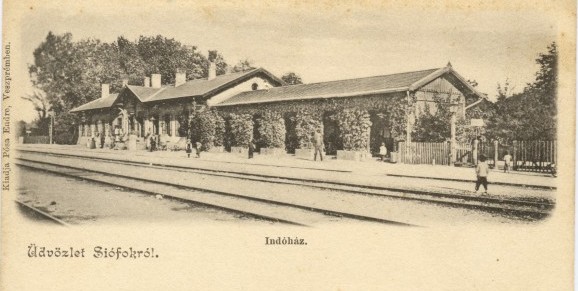 Korabeli képeslap Siófok eredeti felvételi épületéről, melyet még a Déli Vasút épített, és 1863-ban adtak át (forrás: Turóczy László gyűjteménye – vasutallomasok.hu)