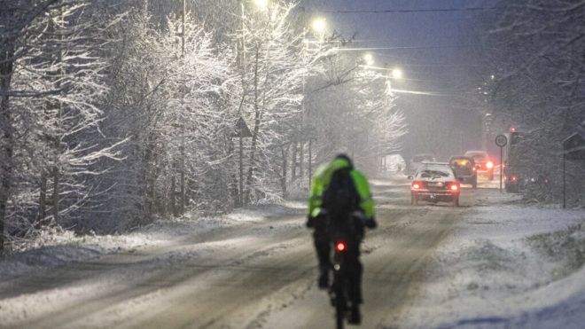 Kerékpáros és személyautók haladnak a hóesésben Pócsmegyeren 2019. december 2-án