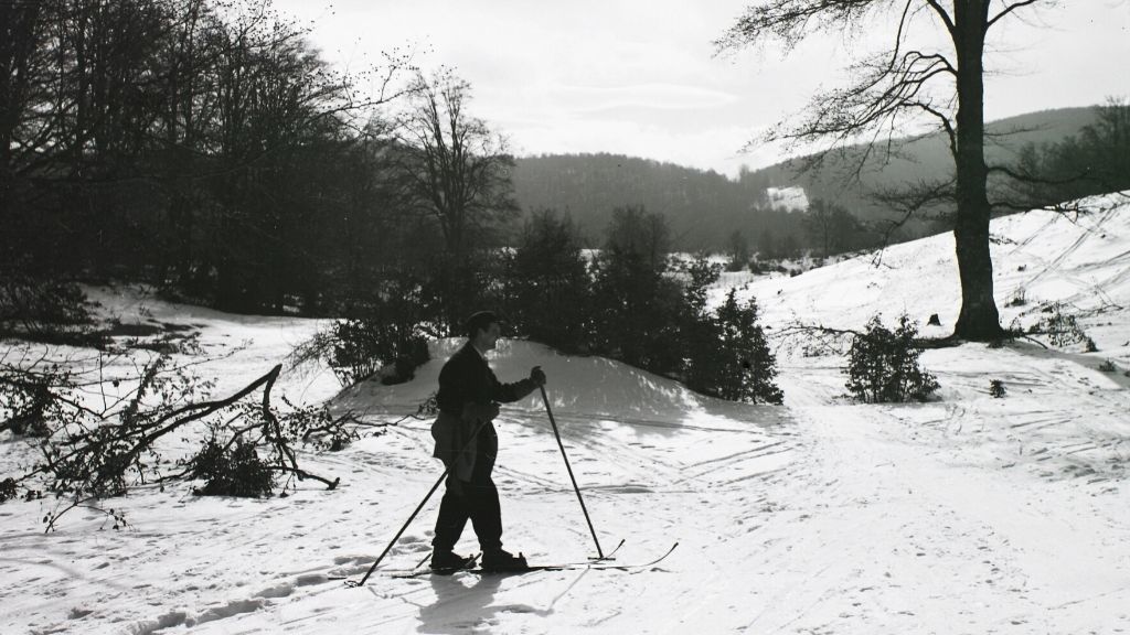 Síléceken közlekedő férfi a Bükk hegységben Nagymezőn 1932-ben