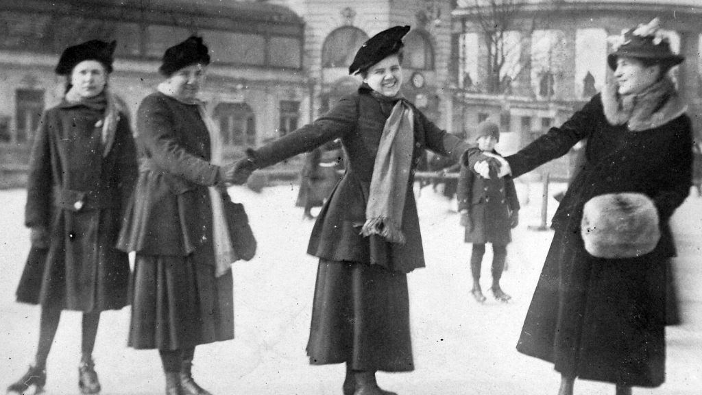 1910 korcsolyázó nők a Városligeti-tavon, háttérben a Millenniumi emlékmű