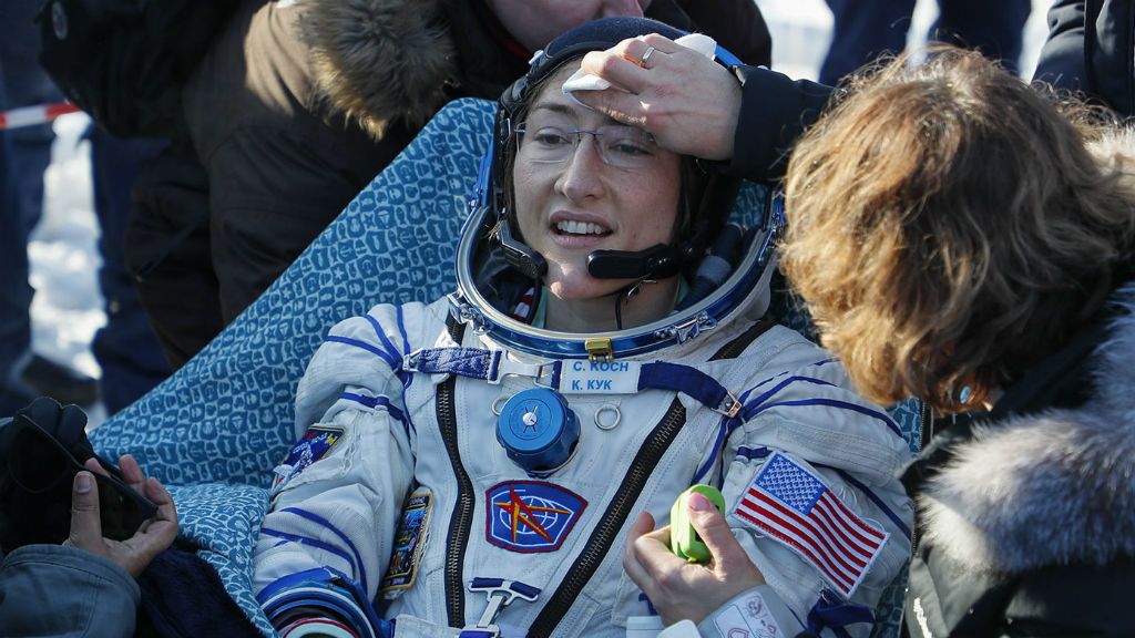 Christina Koch amerikai űrhajós, miután földet ért a Szojuz MSz-13-as orosz űrkapszulával az orosz Alekszandr Szkvorcovval és az olasz Luca Parmitanóval együtt a kazahsztáni sztyeppén, Dzsezkazgan térségében 2020. február 6-án. Koch az expedíciói alatt megjavította a leghosszabb ideig az űrben szolgálatot teljesítő nők rekordját, összesen 328 napot töltött folyamatosan az űrben.