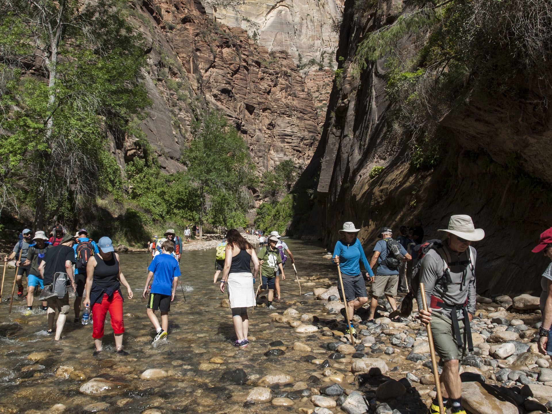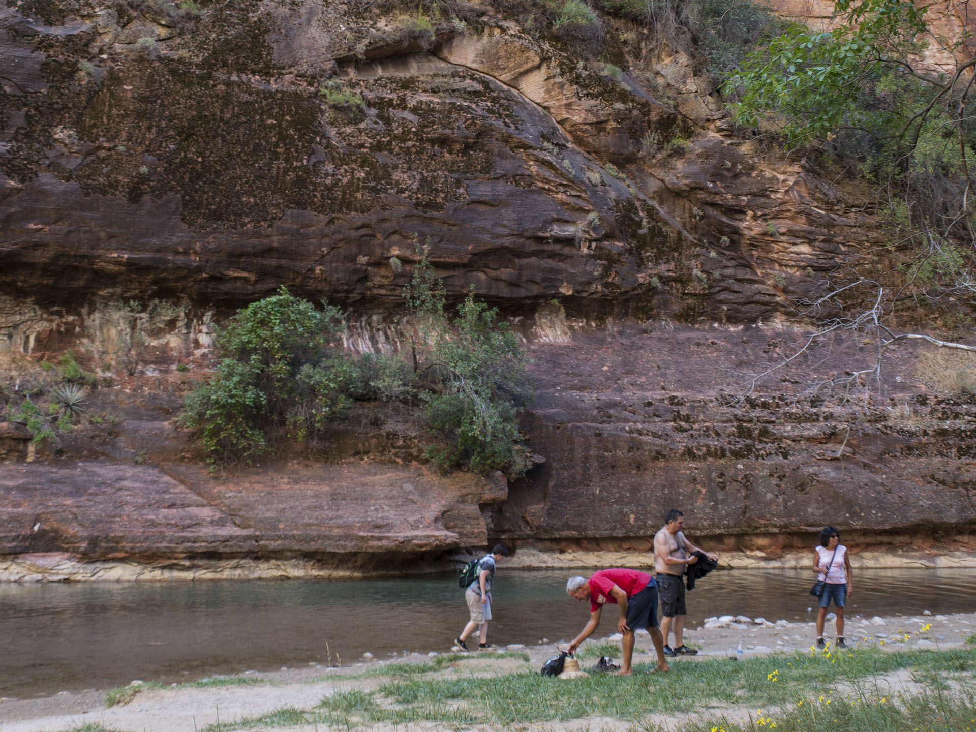 Vörös sziklák, burjánzó zöld növényzet meg egy szép kék folyó, aminek olyan tiszta a vize, hogy még a neve is Virgin (szűz). A Zion Nemzeti Parkban tulajdonképpen semmi idegen nincs az európai szemnek, de az otthonosságba azért mindig vegyül valami, amit még nem látott az ember: ott fent azok a hangyák igazából túrázók az Angels Landing nevű sziklaformáció peremén vezető ösvényen (végig van lánc amúgy az út mentén), itt lent meg egyszer csak elfogy az ösvény, a folyót közrezárják a kanyon falai, de az út megy tovább – a turisták a vízben gázolnak előre a Narrows nevű szakaszon, amihez természetesen speciális cipőt is lehet bérelni a látogatóközpontban. Ah, Amerika!