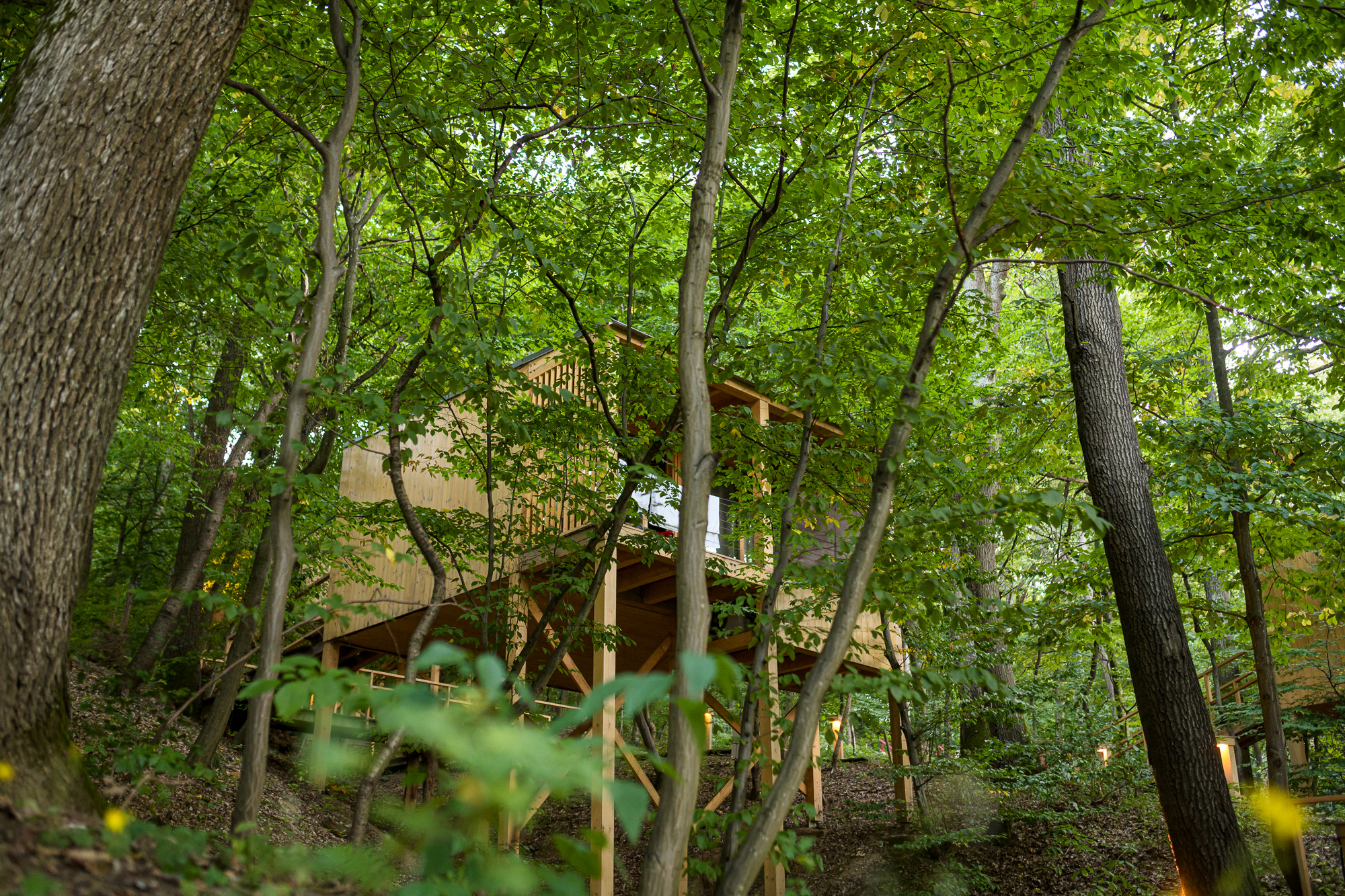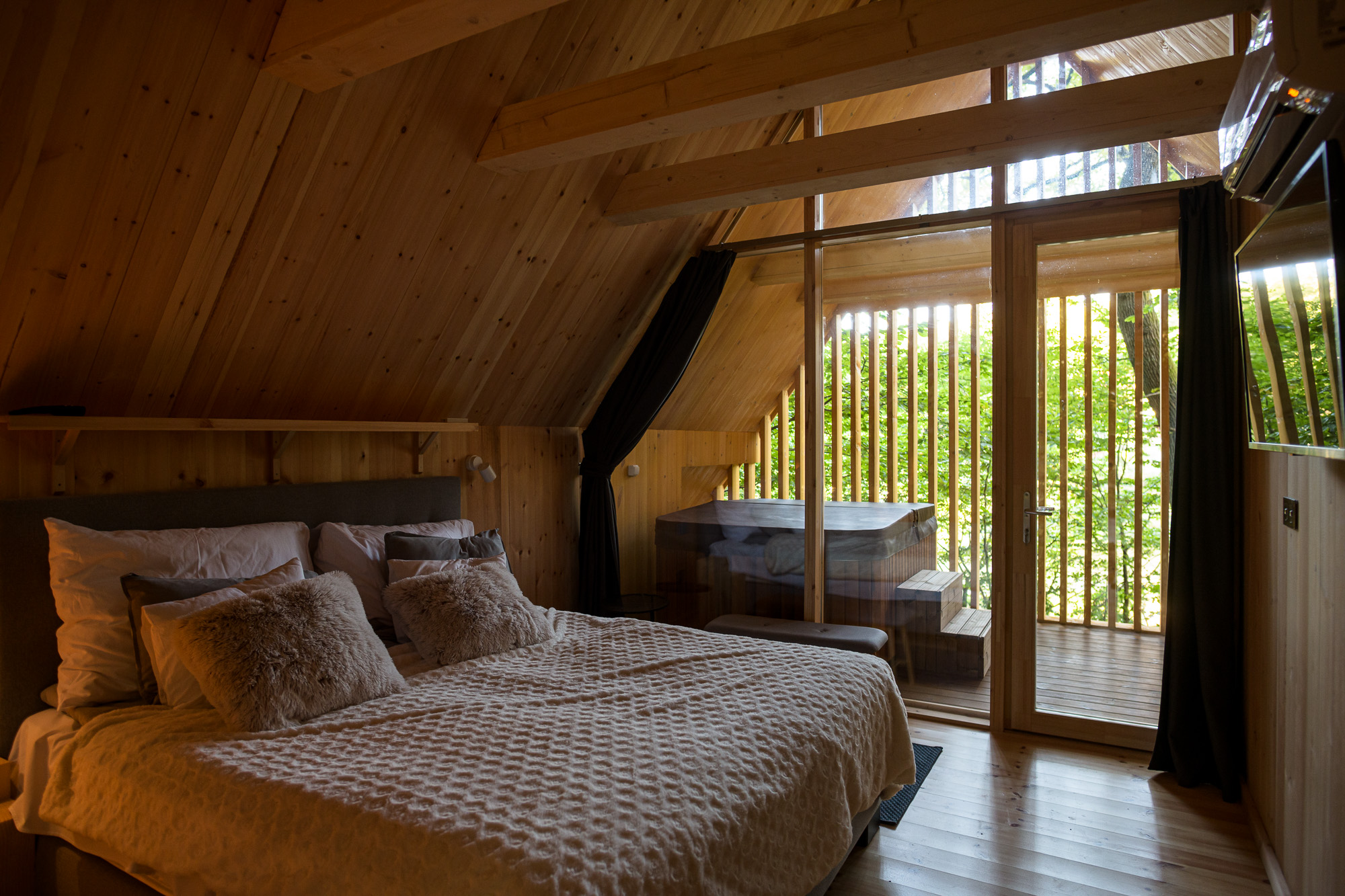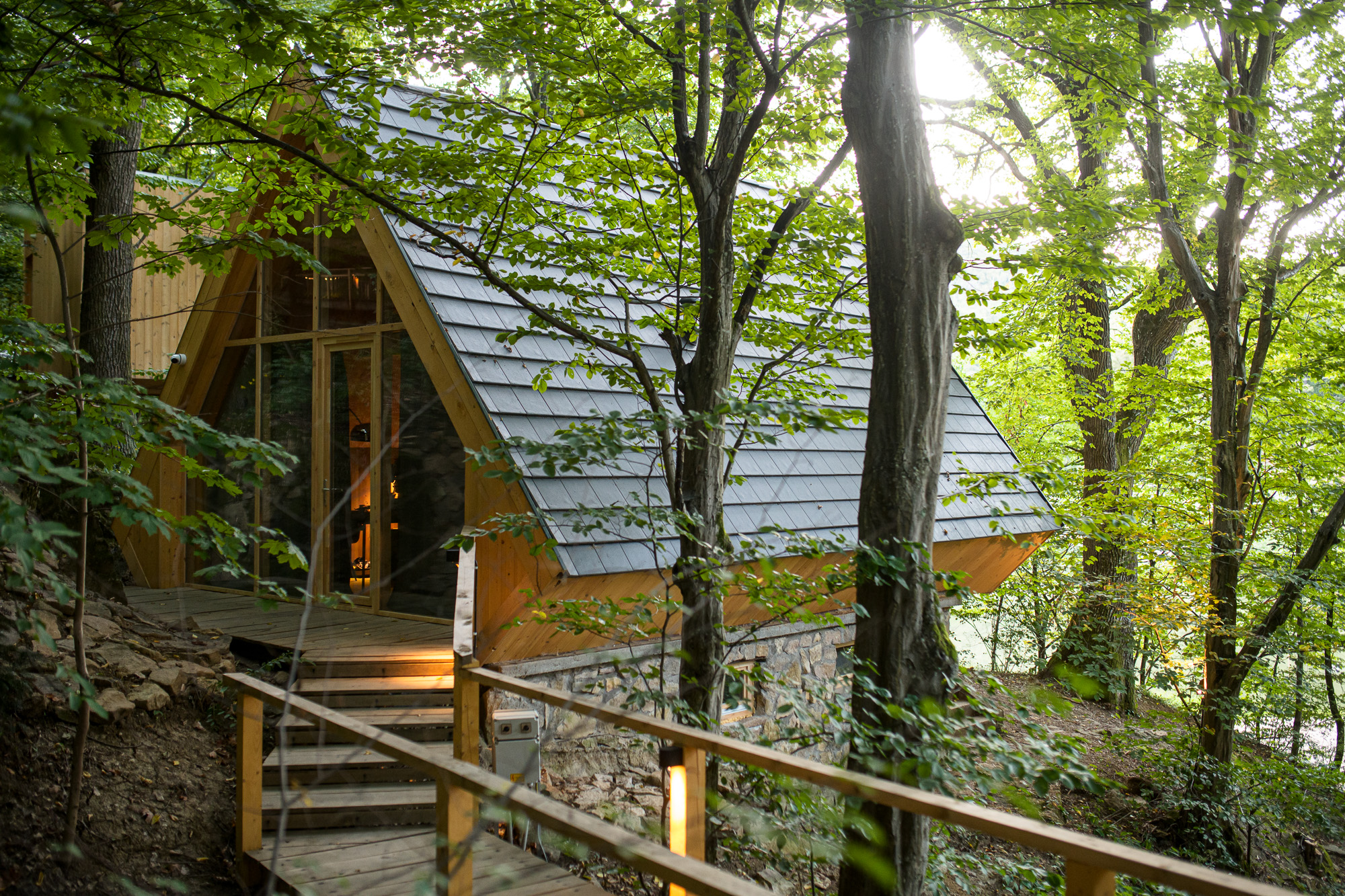 Célállomásunk koordinátái a mesés nevű Kánya-patak és a síkfőkúti alsó tó mellé, az erdőbe, a lombok közé vittek bennünket, itt épült meg ugyanis az a – két személyre tervezett – öt lomház, ami négy csillaggal fejeli meg az elvonulás műfaját. Az év szállása címmel kitüntetett Treehouses az erdő csendjével, illatával, nyüzsgés, család, gyerek és kisállat nélkül, távol a többi vendégtől és személyzettől várja azokat párokat, akik luxuskaranténban szeretnék kisimítani az idegeiket. Hogy ez mit jelent pontosan? Különleges és látványos, egymástól távol eső faszerkezetes házakat, a fa illatába csomagolt letisztult enteriőrt, a fürdőszobában elhelyezett, az erdőre néző privát infraszaunát, extrém kényelmes franciaágyat, az erkélyen beüzemelt pezsgőfürdőt, jól felszerelt minibárt, és reggelente, az ajtó előtt kiskosárban kihelyezett luxusreggelit, (amivel, zárójelben megjegyezném, az ételallergiáktól szenvedőkre is gondolnak).