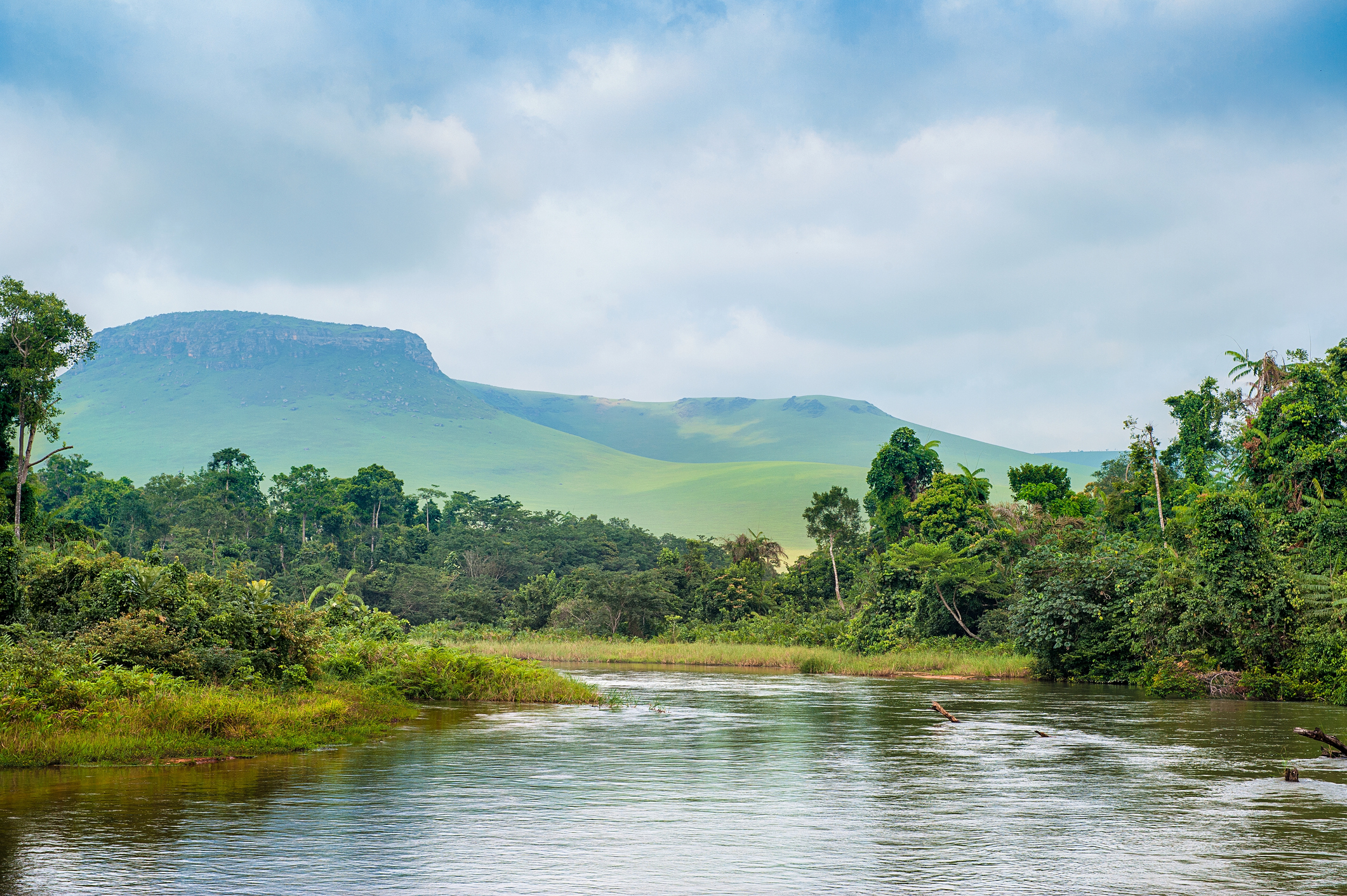 A felhős ég alatt, a dombokon és hegyeken keresztül egy kis folyó Kongó dzsungelében halad (Fotó: Getty Images)