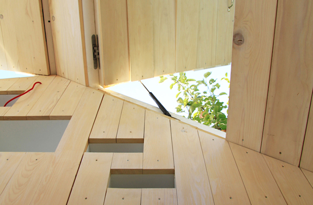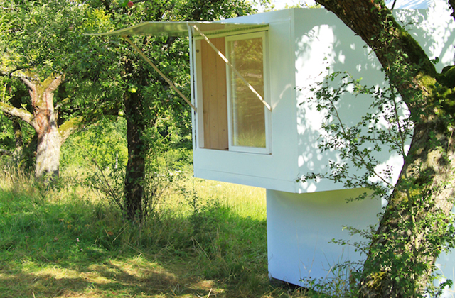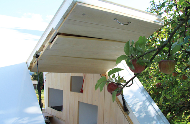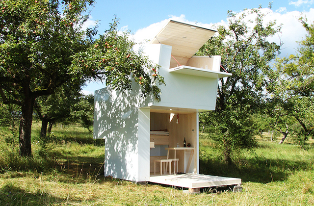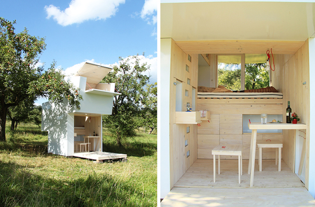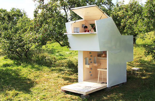 Bárhol könnyedén felállítható, majd ugyanolyan egyszerűen szétszerelhető és szállítható ez a fából készült, mobil nyaraló. A kétszintes épületben konyha, ágy és még egy kis terasz is található.