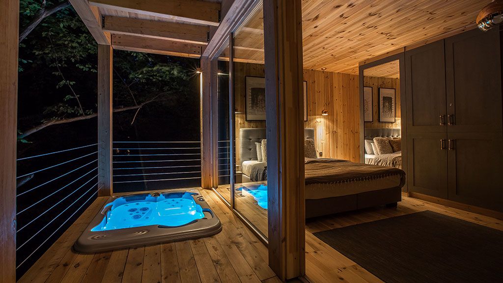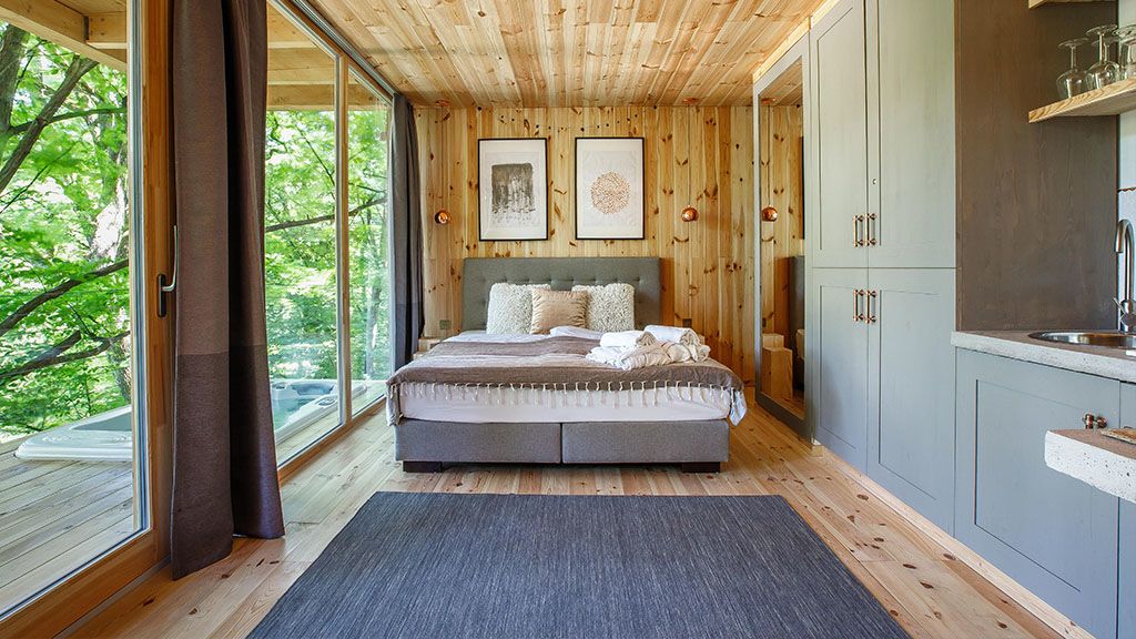 Két új ház is épült a noszvaji erdő fáinak védelmező ölelésében, egy csipetnyi még extrább luxussal fűszerezve. A kétszintes lombházak üveghomlokzattal készültek, belső árnyékolókkal kiegészítve. A földszinten pedig a nappali mellé még egy infraszauna is került. Az emeleten vár bennünket a hatalmas hálószoba és a kényelmes franciaágy, míg a ház legmagasabb pontján, a második emelet tetőteraszán pezseg a jakuzzi forró vize. Csak egy pohár bor hiányzik, és már el is merülhetünk a szerelemben, a természet szépségében vagy éppen a csend varázsában.