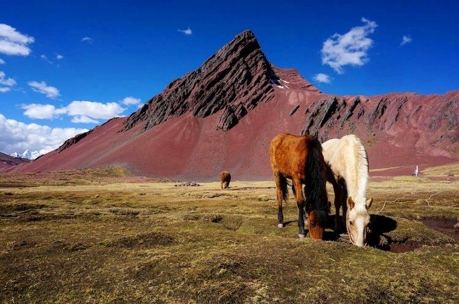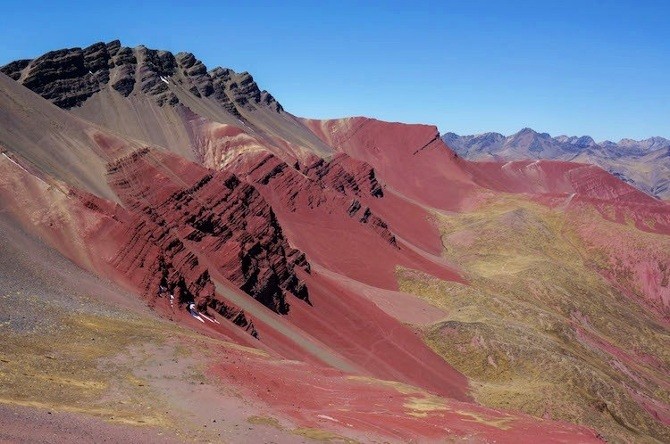 A lenyűgöző hegyek a kék, a narancssárga, a bordó, a zöld, és a piros árnyalataiban játszanak – akár egy perui szőttes.