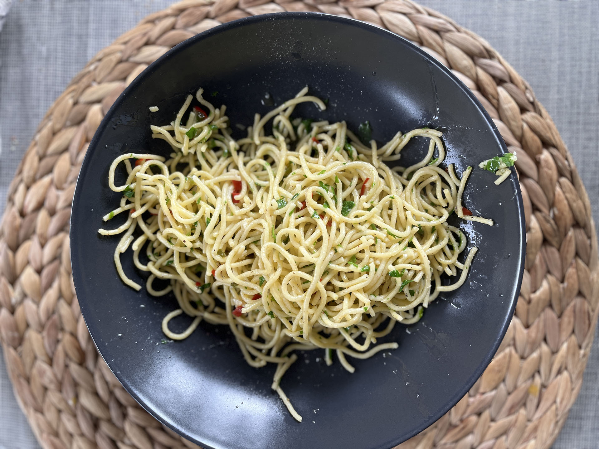 Aglio et olio et peperoncino házi gluténmentes spagettivel (fokhagymás-chilis-petrezselymes tészta)