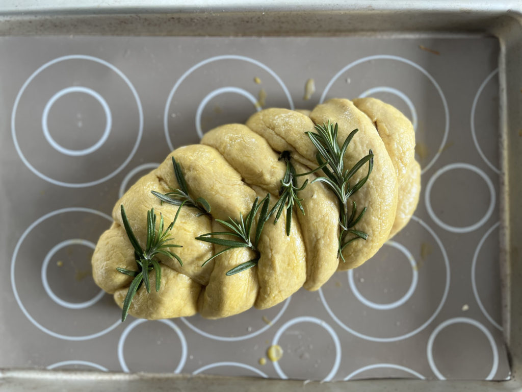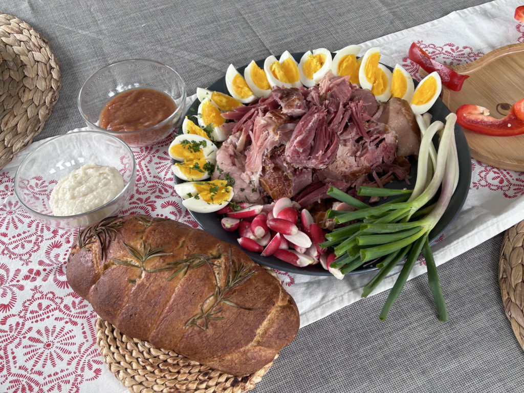Rozmaringos kalács, húsvéti sonka tormával és almaszósszal, újhagyma, retek, főtt tojás turbolyával (gyerekeknek: nélkül)
